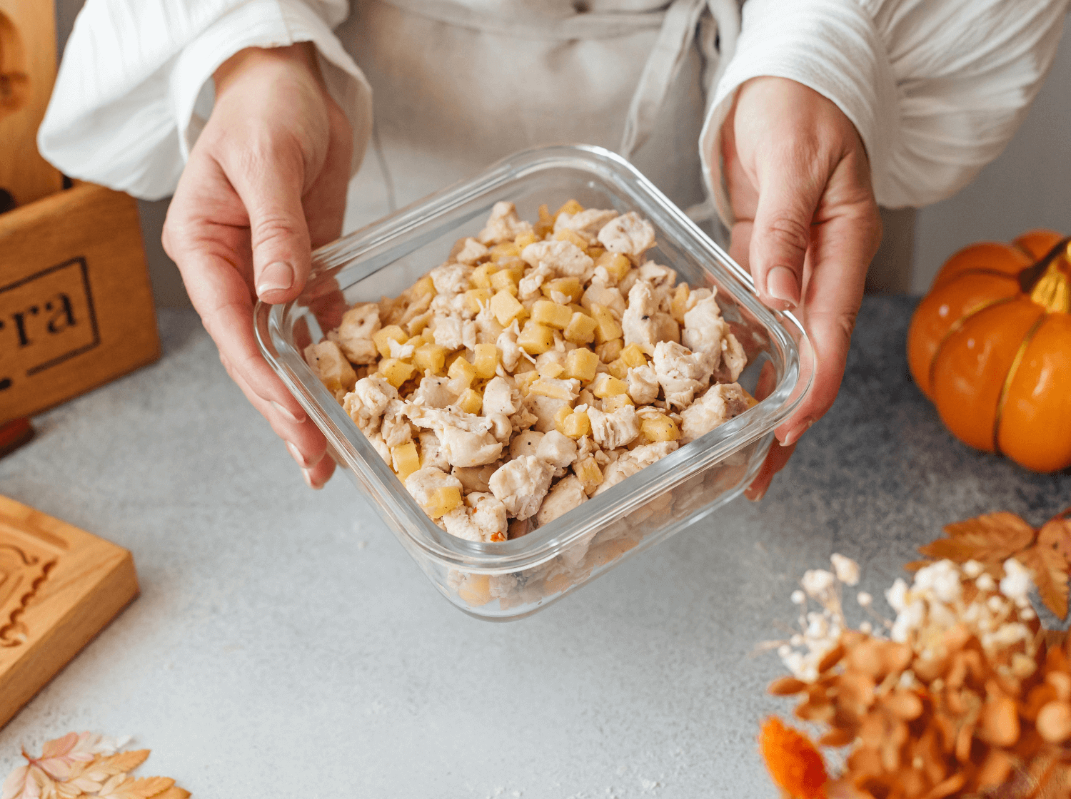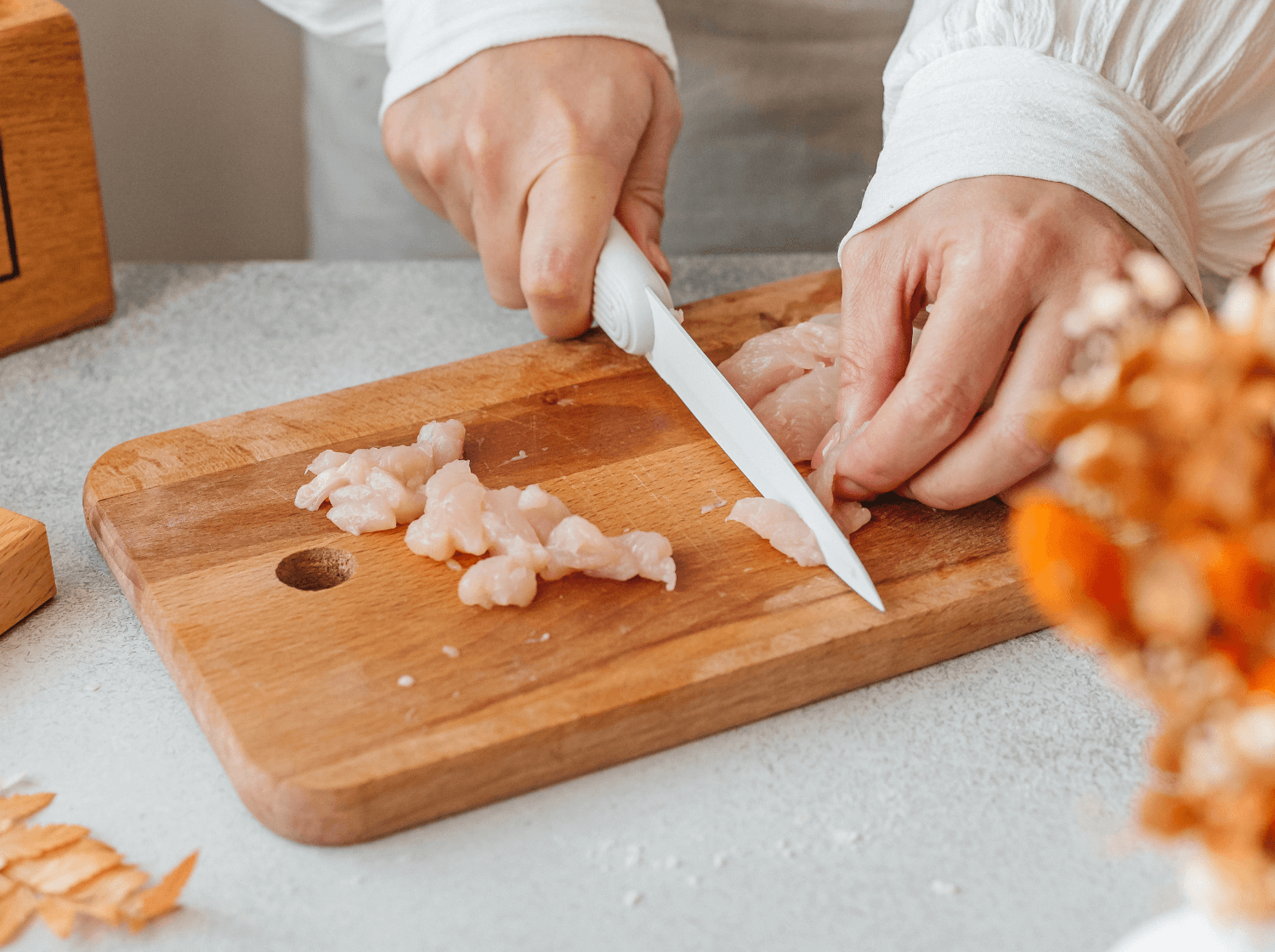 4. Курицу нарежьте мелкими кусочками. Обжарьте в отдельной сковороде с сухим чесноком.
