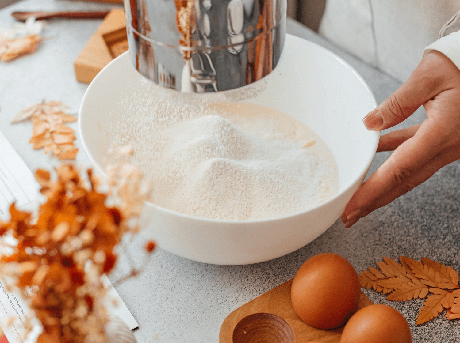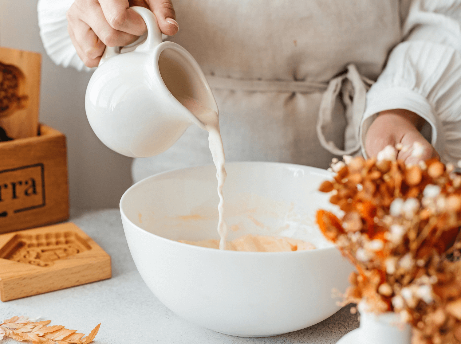 2. Влейте тёплое молоко и добавьте разрыхлитель.