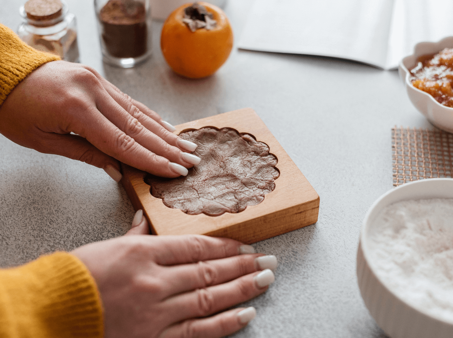 - Аккуратно подушечками пальцев вдавите тесто в форму. Распределите по всей узорной части.