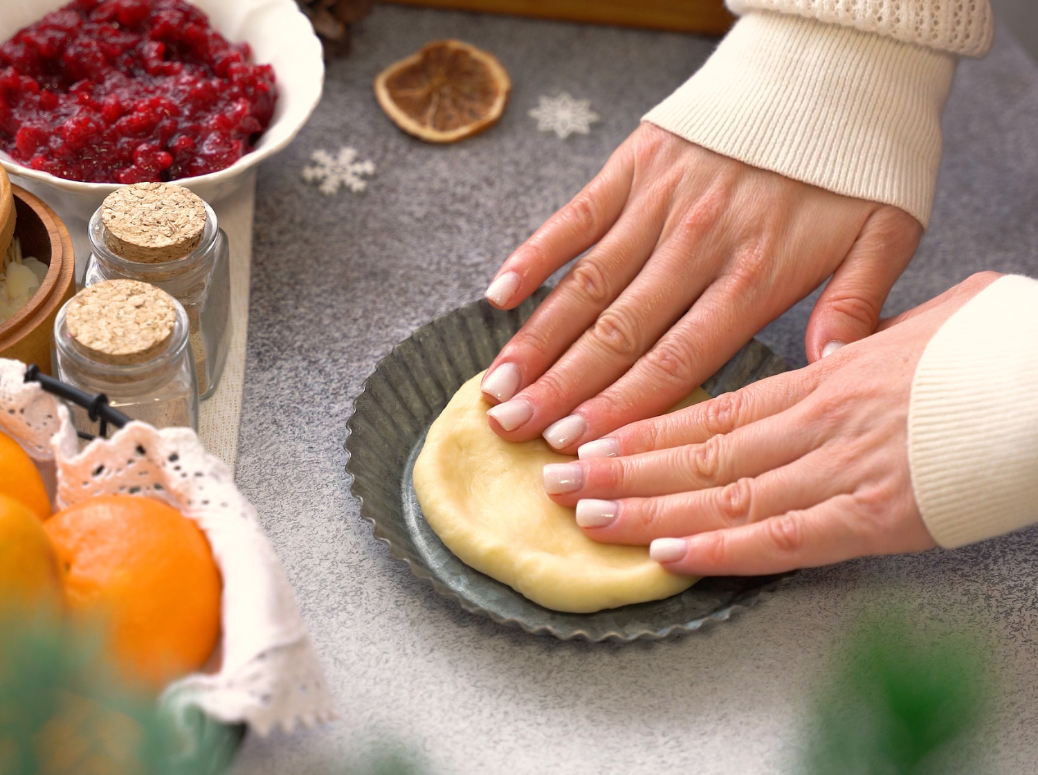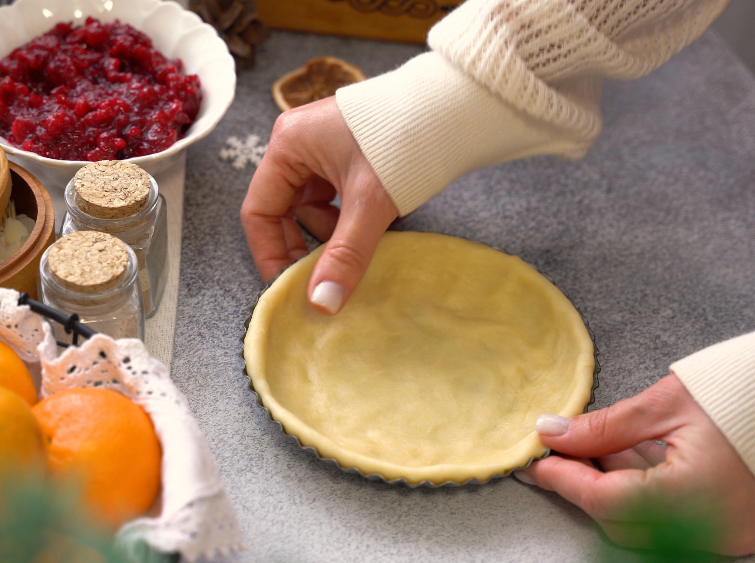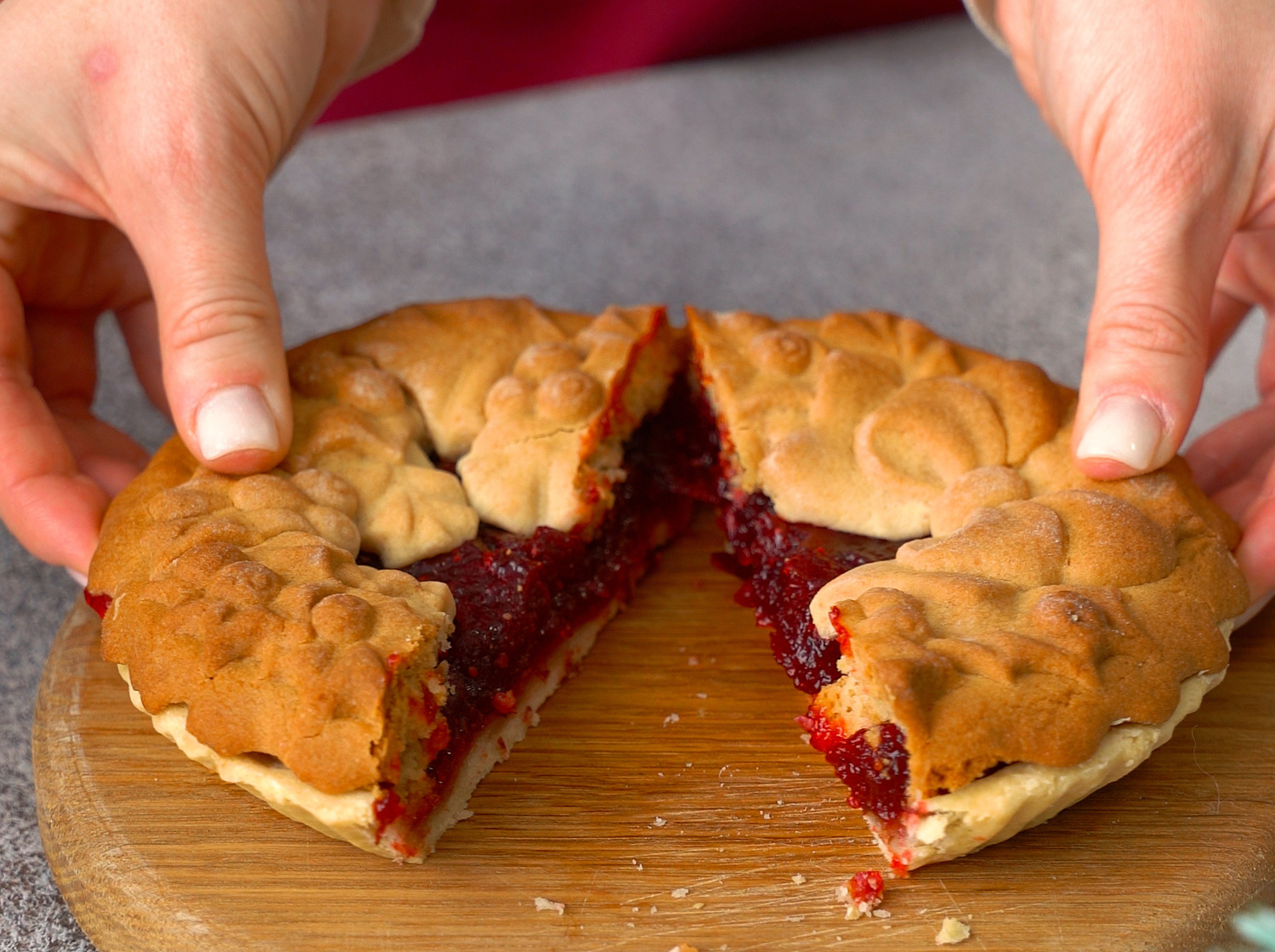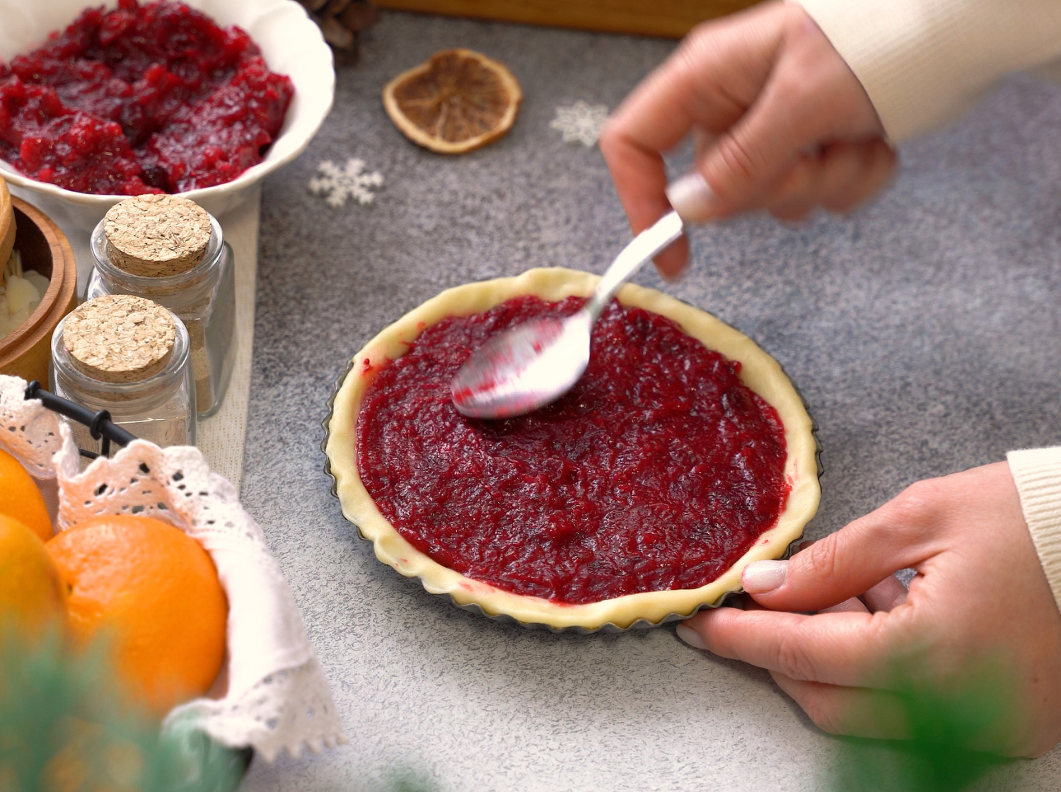 Внутри - нежное песочное тесто и яркая кисло-сладкая начинка из клюквы. Вкусно, празднично и по-домашнему.