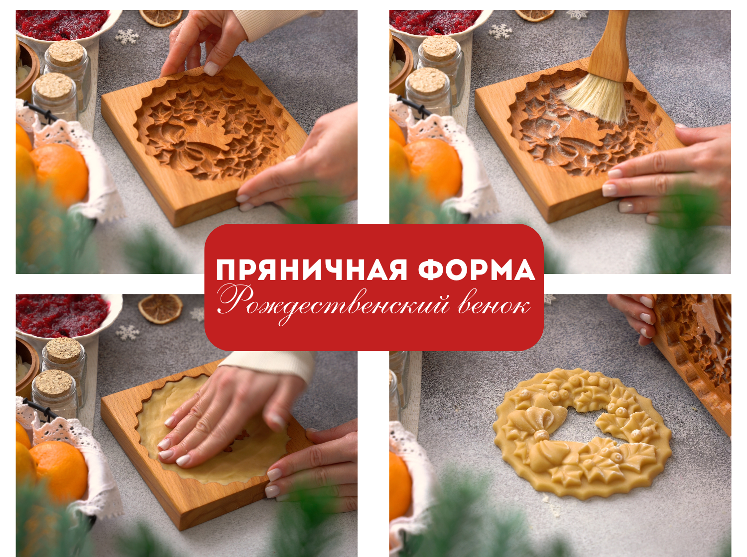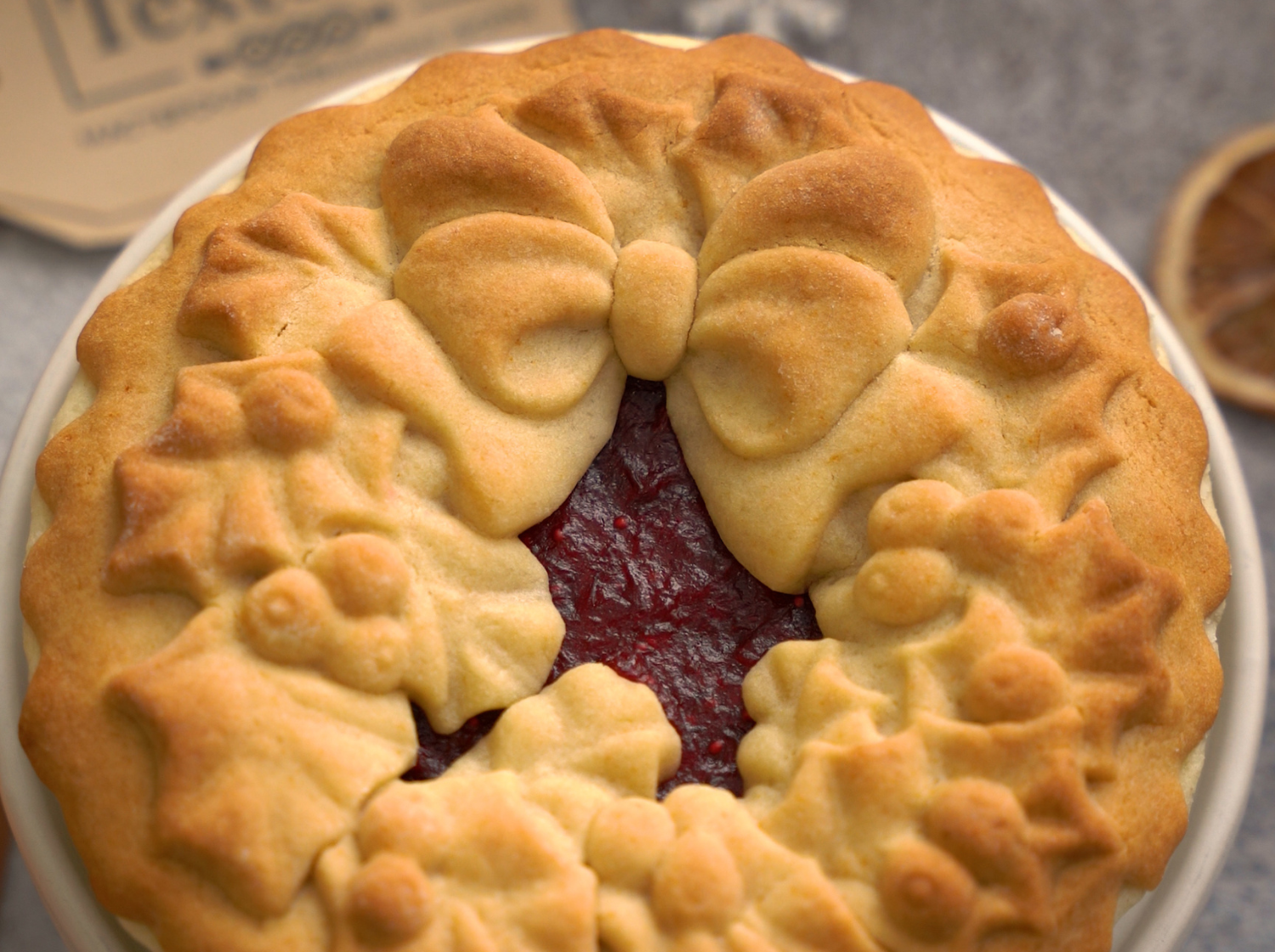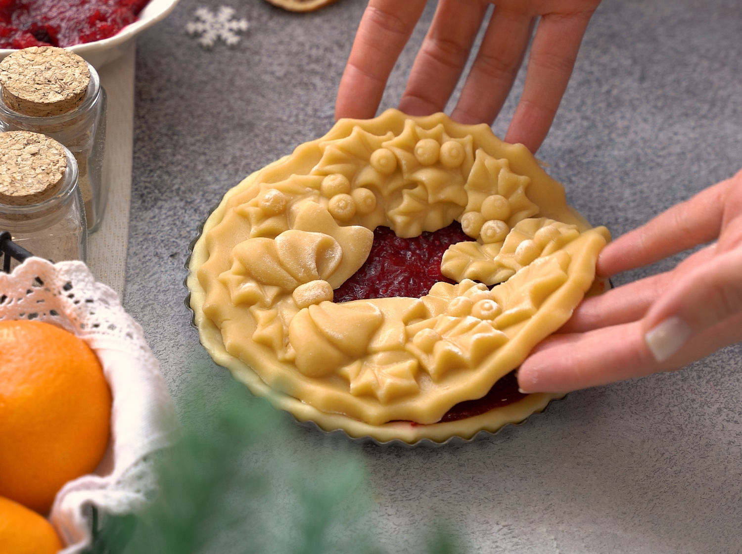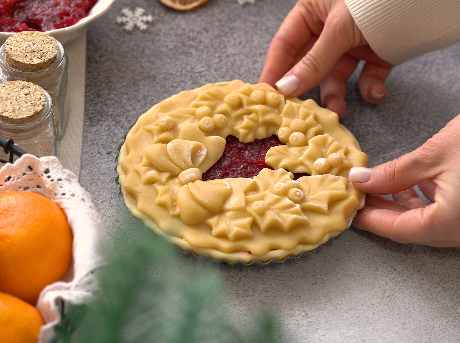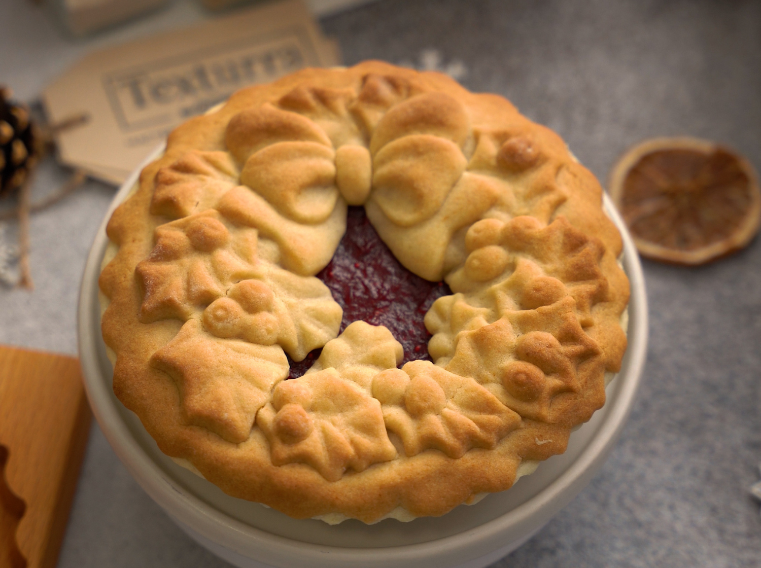 9. При помощи формы Текстурра Рождественский венок подготовьте заготовку-украшение пирога. Тесто распределите по узорной части доски, не заполняя середину - это будет наше "окошко".