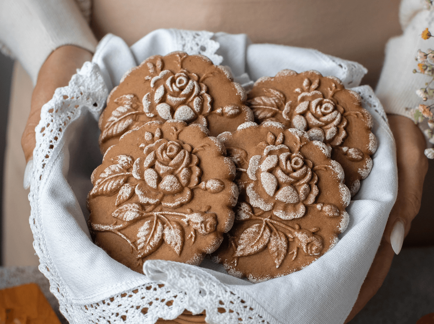 Пряники выполнены при помощи резной деревянной формы для пряников Текстурра Прованская роза